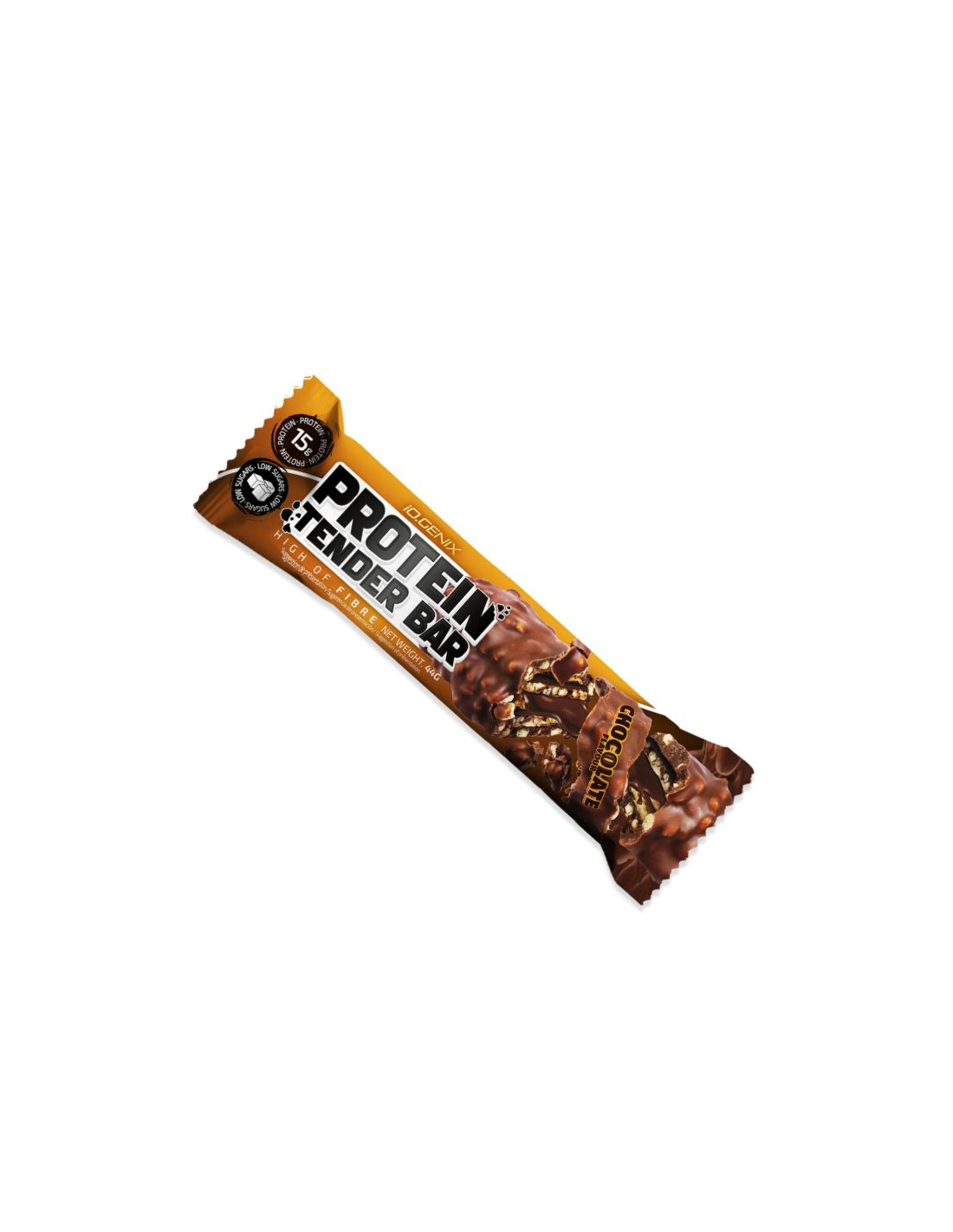 Protein Tender Bar d'IO.Genix est une barre protéinée crunchy qui place la protéine en premier ingrédient, et non le maltitol ou d'autres polyols comme la majorité des barres du marché. Chaque barre de 42 g apporte 15 g de protéines, seulement 1,2 à 1,5 g de sucre et plus de 10 g de fibres. Sa texture croustillante unique provient d'un assemblage minutieux de chips de protéine de soja, de protéine de lait et de blanc d'œuf en poudre.