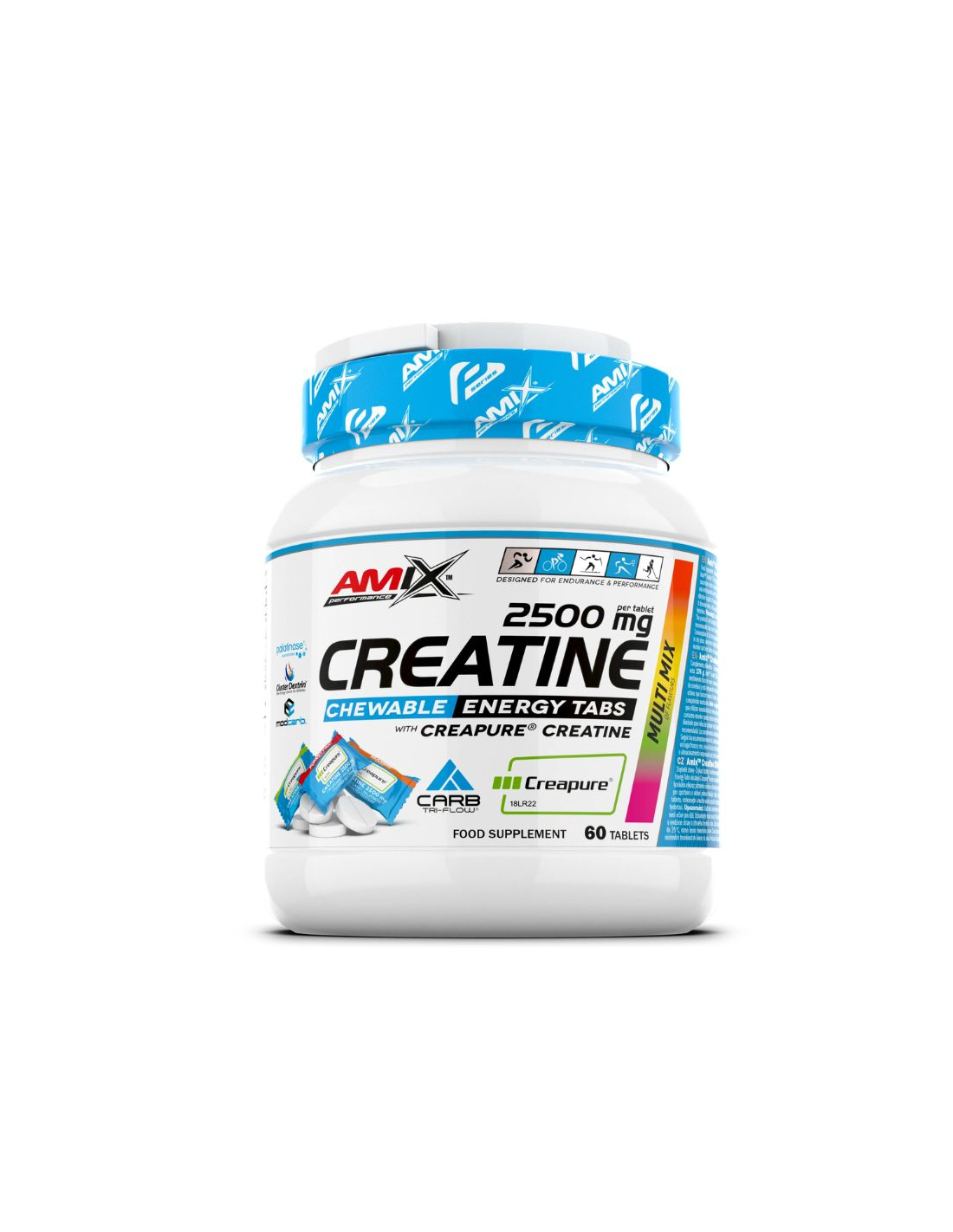 Creapure® - monohydrate de créatine, liants: sorbitol, dextrates; AMIX ™ CARB TRI-FLOW 2,2% complexe (isomaltulose / palatinose ™ / - Source de glucose et fructose, grappe de dextrine cyclique hautement ramifiée, quinoa, amaranth, saracène blé, millet /), régulateur de l'acidité: mallico; Lubrifiant: mono et diglycéride des acides gras; Arôme, édulcorant: sucralosae.