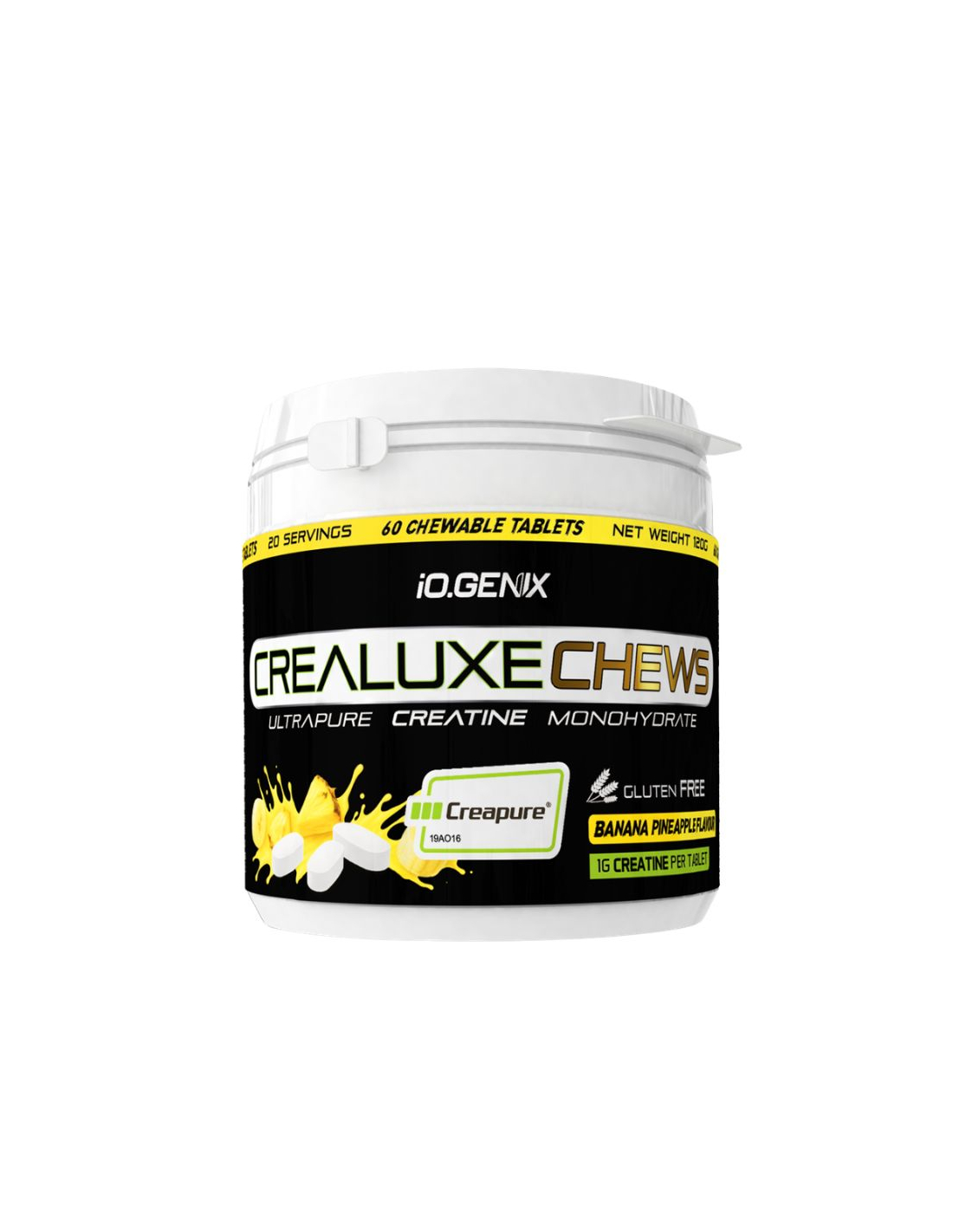Crealuxe Chews Creapure® de IO.Genix est un complément de créatine monohydrate présenté sous forme de comprimés masticables. Chaque comprimé apporte 1g de créatine Creapure®, une matière première reconnue pour sa pureté et produite en Allemagne. Ce format permet de consommer sa créatine sans shaker ni préparation. Crealuxe Chews s’adresse particulièrement aux pratiquants de musculation souhaitant soutenir leur force, leur puissance et leur progression à l’entraînement.