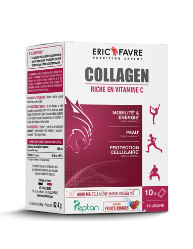 Collagen Eric Favre est une formule en poudre à base de collagène marin hydrolysé Peptan®, enrichie en vitamine C. Ce produit contribue à la formation normale du collagène, favorise la mobilité, réduit la fatigue et lutte contre le stress oxydatif. Chaque dose apporte 8000 mg de collagène et 80 mg de vitamine C. Facile à consommer au quotidien il est parfait pour soutenir les articulations, les cartilages et l'élasticité de la peau.