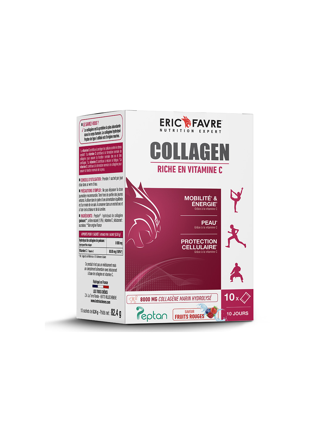 Le Collagen Eric Favre se distingue par l'utilisation du Peptan®, une forme de collagène hydrolysé de type I reconnue mondialement pour sa pureté, sa biodisponibilité et son efficacité. Sa formulation hautement dosée à 8000 mg par prise permet un apport optimal. L'ajout de vitamine C renforce les bénéfices en stimulant la synthèse naturelle de collagène, tout en offrant une protection antioxydante et un soutien contre la fatigue. La saveur fruits rouges, agréable et naturelle, facilite l'intégration quotidienne. Ce produit a été cliniquement testé, assurant une qualité premium adaptée aux sportifs exigeants et aux personnes actives.
