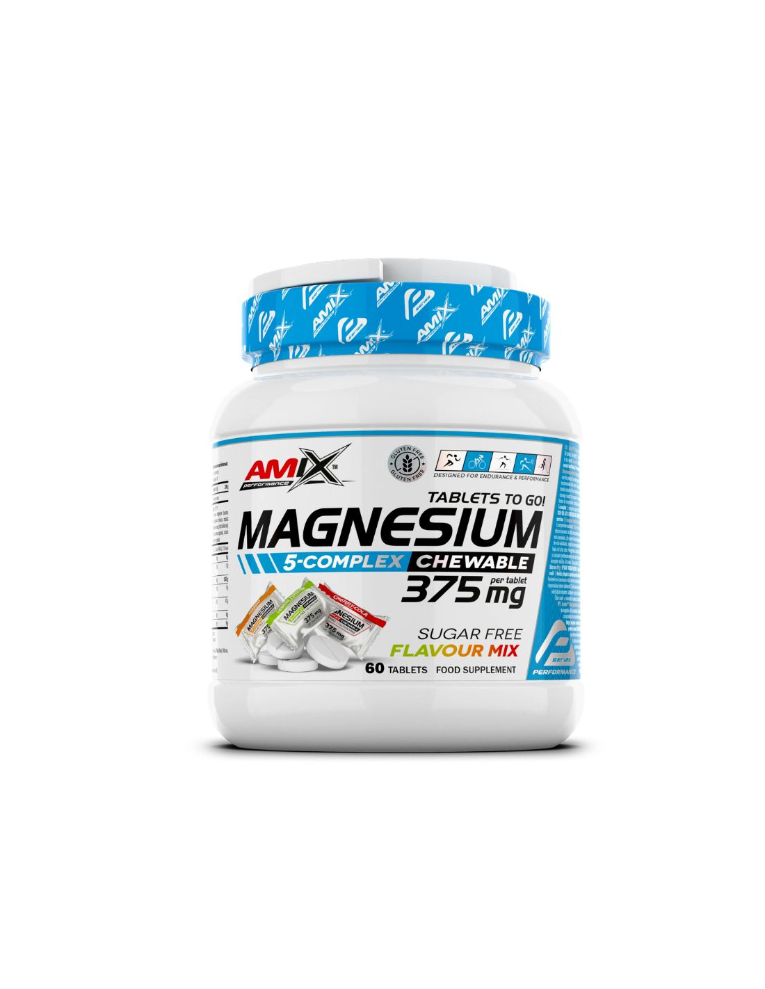 Magnésium à croquer d'Amix Performance est un complément alimentaire innovant qui réunit 5 formes de magnésium dans un seul comprimé à croquer : bisglycinate chélaté, citrate, malate, taurate et ascorbate. Chaque comprimé délivre 375 mg de magnésium, soit 100 % des valeurs nutritionnelles de référence. Formulé sans gluten et sans sucres ajoutés, ce produit cible les sportifs pratiquant la musculation et toute personne souhaitant réduire la fatigue, soutenir la fonction musculaire et favoriser le bon fonctionnement du système nerveux. Son format à croquer élimine le besoin d'eau et facilite la prise au quotidien.
